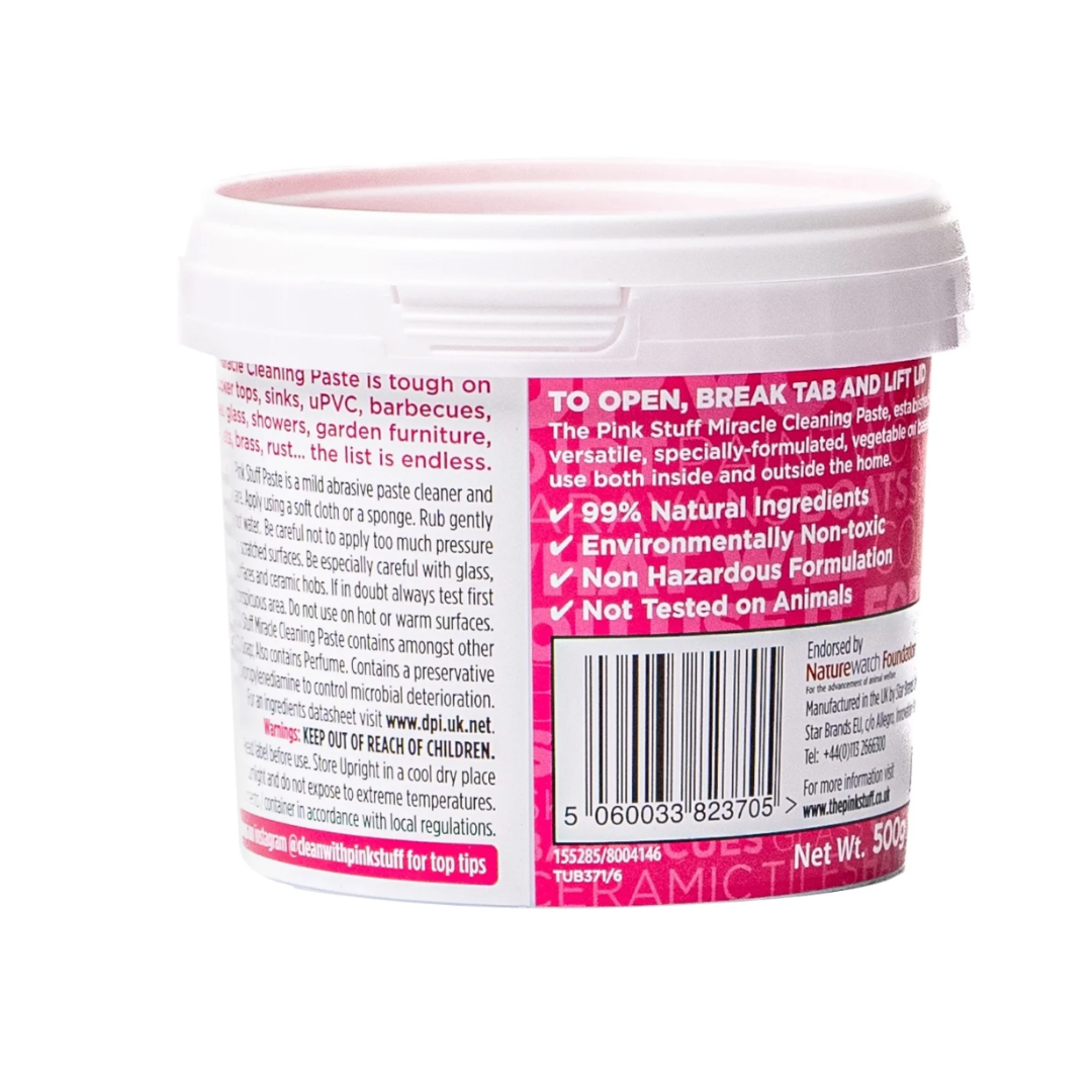 The Pink Stuff es una pasta limpiadora rosa de 500 gramos que se integra fácilmente en tu kit de limpieza. Su fórmula eficaz elimina la suciedad incrustada en diversas superficies, desde cocina hasta baño, sin dañar ni rayar. Además, es una opción responsable con el medio ambiente, permitiéndote mantener tu hogar impecable mientras cuidas el planeta. Ideal para quienes buscan resultados profesionales con un producto versátil y sostenible.
